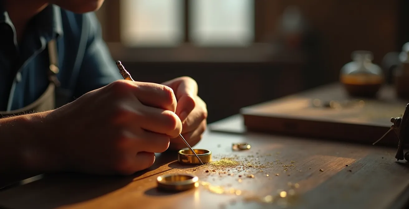Une fois l’intention définie, la première grande décision technique concerne la gravure. Ce choix n’est pas seulement esthétique ; il conditionne la manière dont le bijou va vivre et vieillir avec vous, surtout s’il s’agit d’une alliance destinée à être portée en permanence. Les deux grandes techniques, la gravure manuelle et la gravure laser, offrent des résultats et une âme radicalement différents. Comprendre leurs spécificités est crucial pour aligner la finition avec votre histoire.