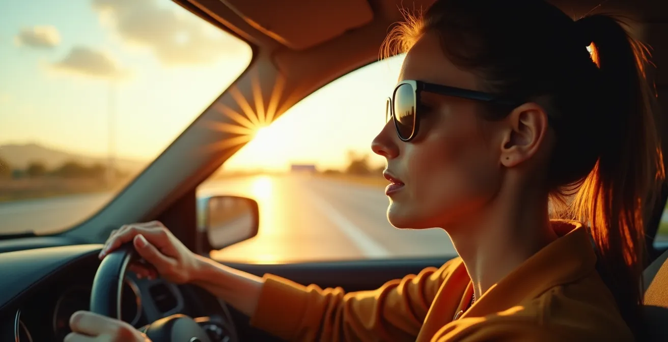 Face au soleil rasant ou à une route détrempée, le premier réflexe est de plisser les yeux. L’éblouissement, souvent perçu comme un simple désagrément, est en réalité un facteur de risque majeur au volant. Il ne s’agit pas seulement d’un inconfort passager, mais d’une véritable surcharge d’informations inutiles pour notre cerveau, qui doit alors redoubler d’efforts pour distinguer les dangers réels. Beaucoup pensent qu’une simple paire de lunettes de soleil suffit, se concentrant uniquement sur la teinte ou la protection UV. C’est une vision incomplète du problème, qui néglige la nature même de la lumière la plus dangereuse : la lumière réfléchie.